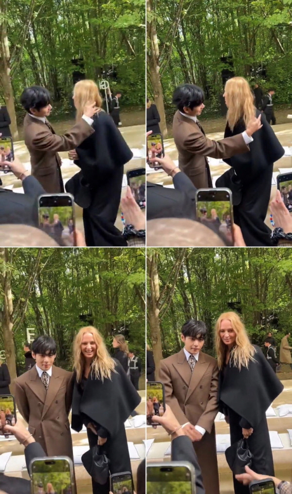 特に、女優ユマ・サーマンとの瞬間は、世界中のファンたちを熱狂させた。フォトタイムの直前、ユマ・サーマンが髪を整えようとすると、Vが直接手を差し出して手伝うシーンがとらえられた。ユマ・サーマンは明るく笑って感謝の挨拶を伝え、この温かい交流はまさに「世界が見たマナー男」の瞬間だった。