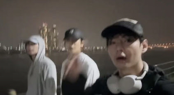 三人は、帽子を深くかぶって漢江を歩き、ゆったりとした時間を過ごしている。