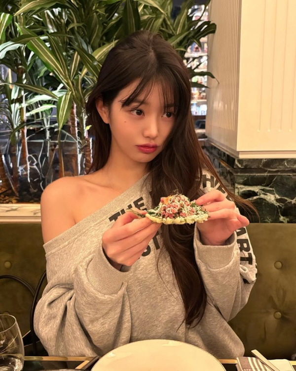 もう一つの写真では、快適な灰色のトレーナー姿で食事中のチャン・ウォニョンの姿が盛り込まれた。オフショルダーシルエットが際立つカジュアルルックにも、特有のグラビアのようなビジュアルを披露して、ファンたちの感嘆を誘った。