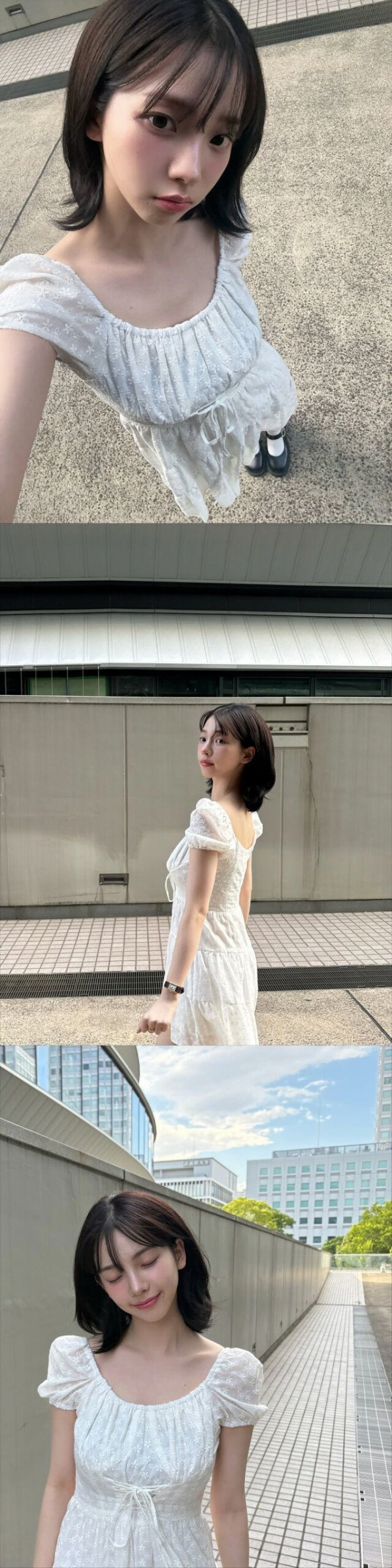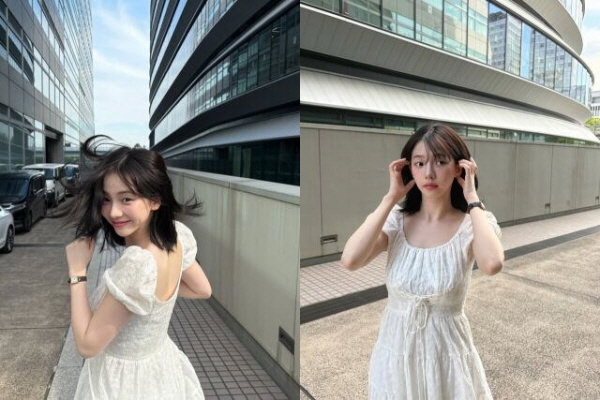 白いワンピースとメリージェインシューズを合わせて清楚な雰囲気を醸し出し、風になびく髪の毛まで加わり、一本のグラビアのようなワンシーンを完成させた。
