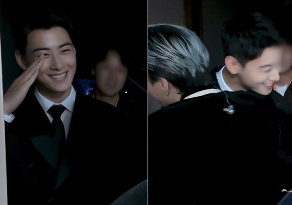 G-DRAGONはボディチェックを終えた後、イベント会場に入った。彼はそこで、晩餐公演の司会を引き受けたASTROチャ・ウヌに会った。現在、兵役中の軍人の身分であるチャ・ウヌは、軍服ではなく、スーツ姿で登場し、G-DRAGONを見るとすぐに明るく笑って敬礼のポーズをとった。G-DRAGONは彼の手をにぎって応え、そして抱擁で後輩を励ました。今年7月に陸軍に入隊して国防部軍楽大隊ファンファーレ隊で勤務中のチャ・ウヌは、今回のAPEC首脳公式歓迎晩餐で司会を行なった。