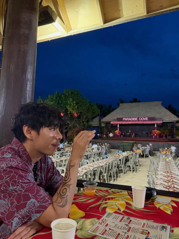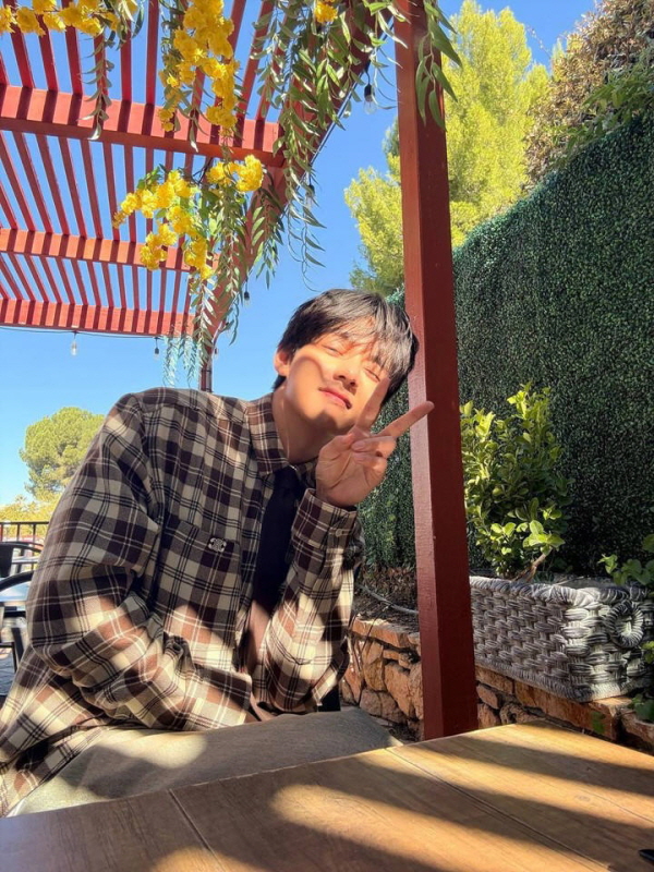 続いて公開された日常ショットでは、チェック模様のシャツを着て野外カフェでブイサインをした姿が盛り込まれている。