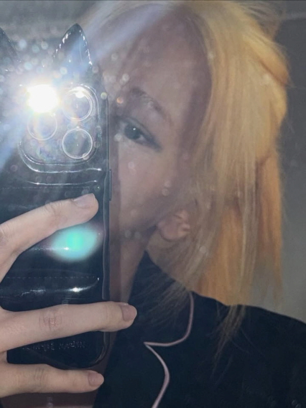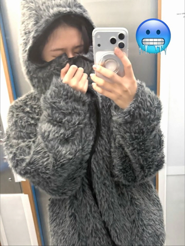 また別の写真では、ブロンドヘアを結んで、猫の形のスマホケースに入ったスマホで鏡の自撮りを残した。灰色のファーフードをあごまで引き上げた自撮りでは、真冬の風を避けるかわいらしい現実「バンハン(防寒)ルック」を披露した。