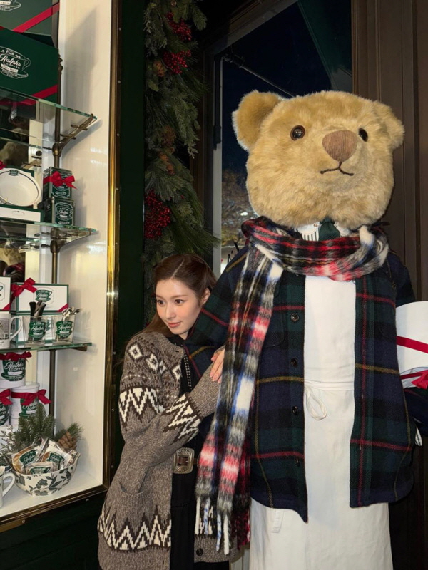 今年も暖かい冬に…TWICEサナ、優しい感謝の挨拶…大きなクマのぬいぐるみの間で笑顔