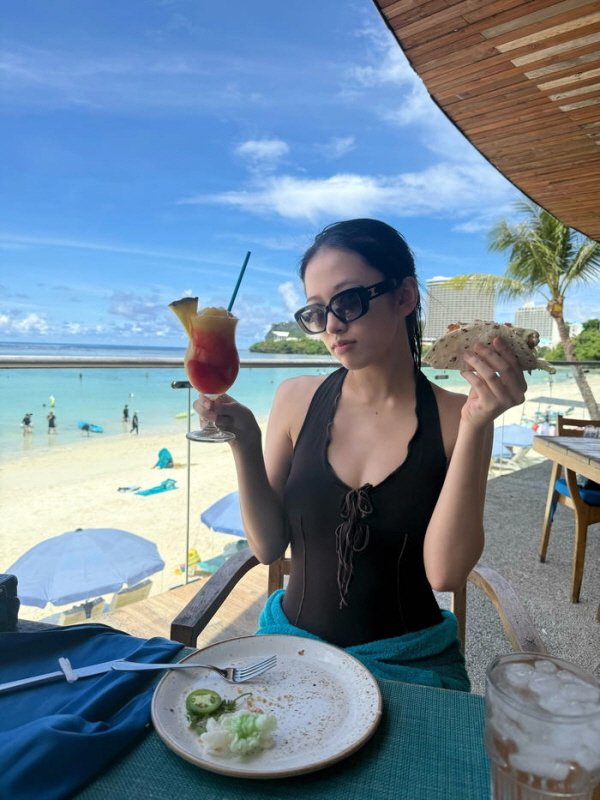 ホワイトカラーの刺繍ノースリーブトップスを着て、シャンパングラスを持っている姿では、成熟した雰囲気が漂っている。黒いビキニにシースルーカバーアップをマッチさせた写真では、贅肉一つない完璧なボディと直角の肩ラインを披露した。