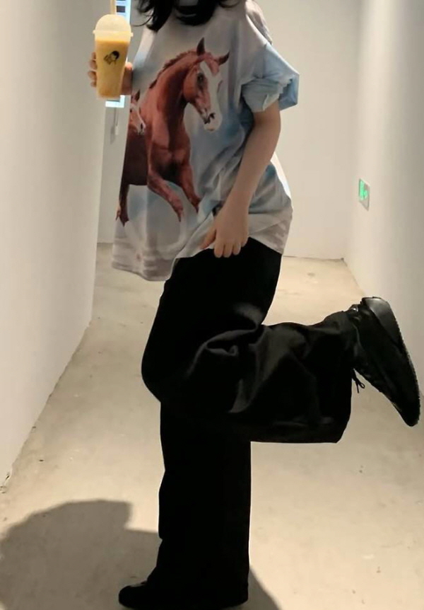 水色と白が広がる背景の上に、ダイナミックな馬のグラフィックを大胆に乗せたデザインは、ヴィンテージ感性とウィットに富んだムードを醸し出し、ルーズに落ちるシルエットは特有のヒップホップさを完成させる。