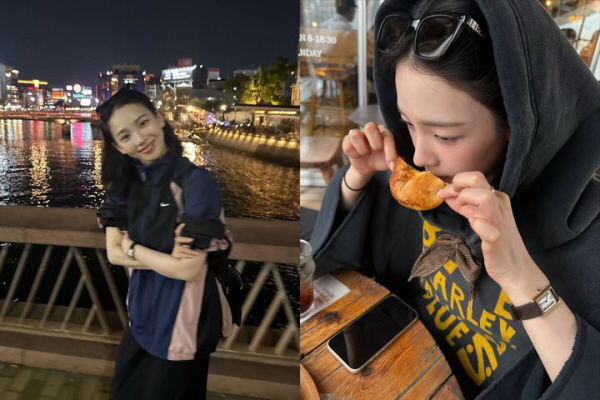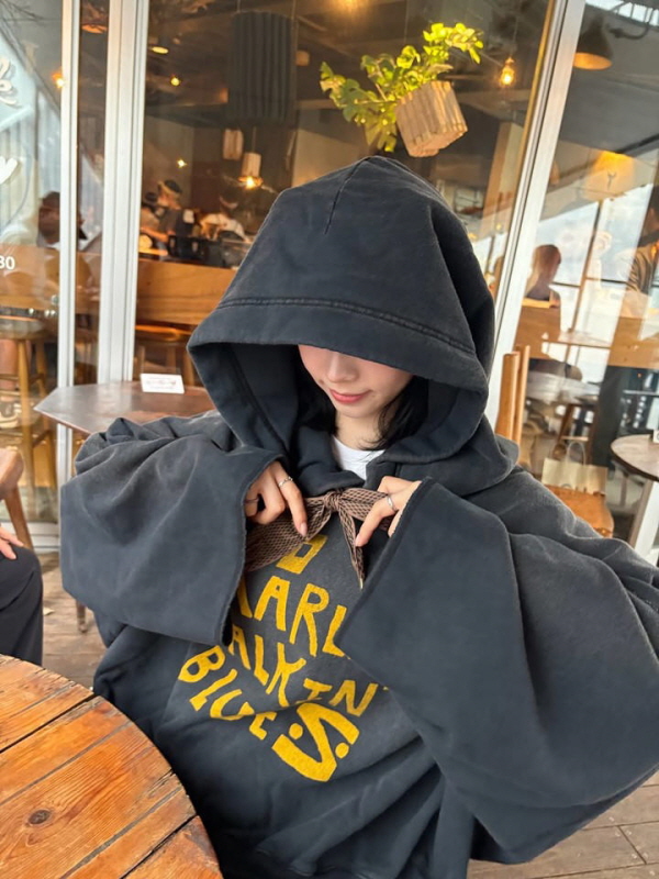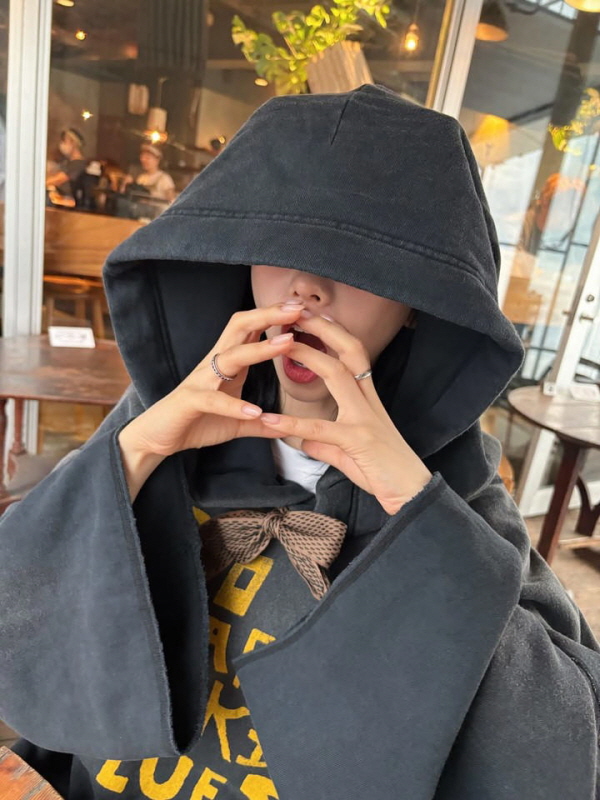 公開された写真の中、カリナは暗いカラーのオーバーフィットフードパーカーを着て、カフェでゆったりとした時間を過ごしている。