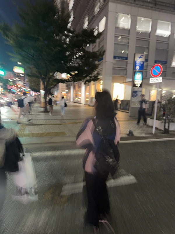 続いて公開された夜の街の写真では、ブラックとピンクの配色のジャンパーを着ている笑顔のカリナの姿が盛り込まれた。街の明かりと調和した生気溢れる表情は、先のカフェのカットとはまた別の魅力を披露する。