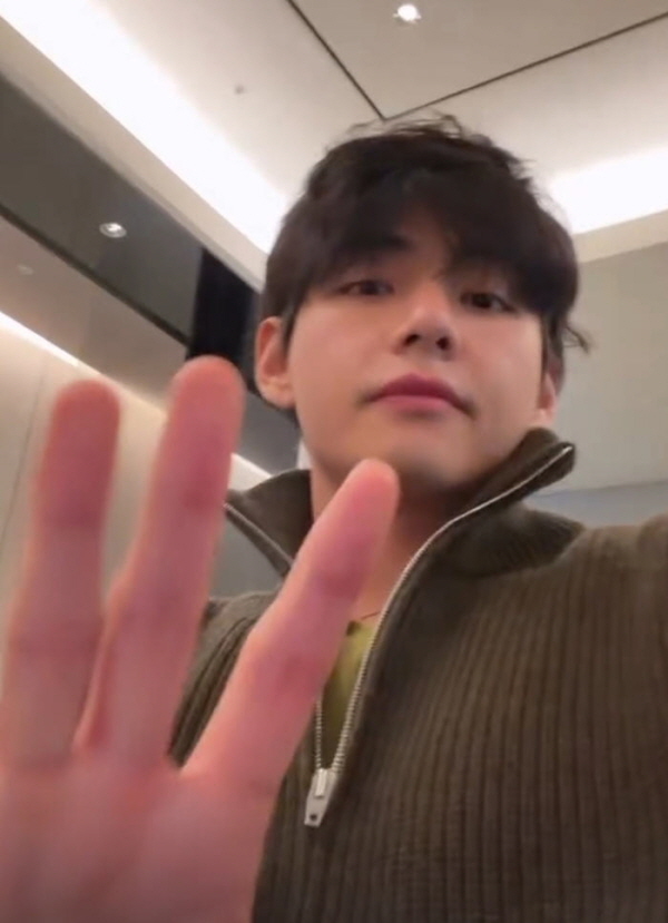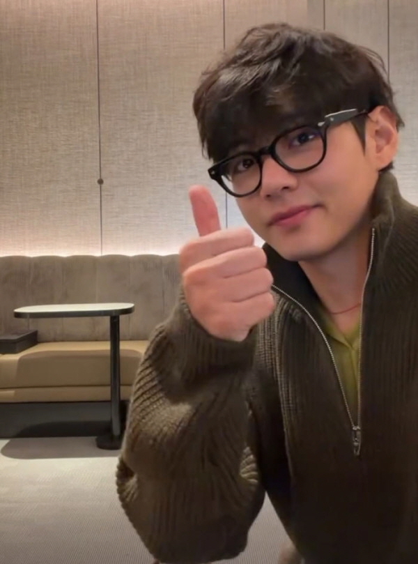 Vは、太めのフチのメガネにブラウンニットを着て、彫刻のようなビジュアルを披露した。また、ファンたちに向かって手を振る挨拶をして目を引いた。