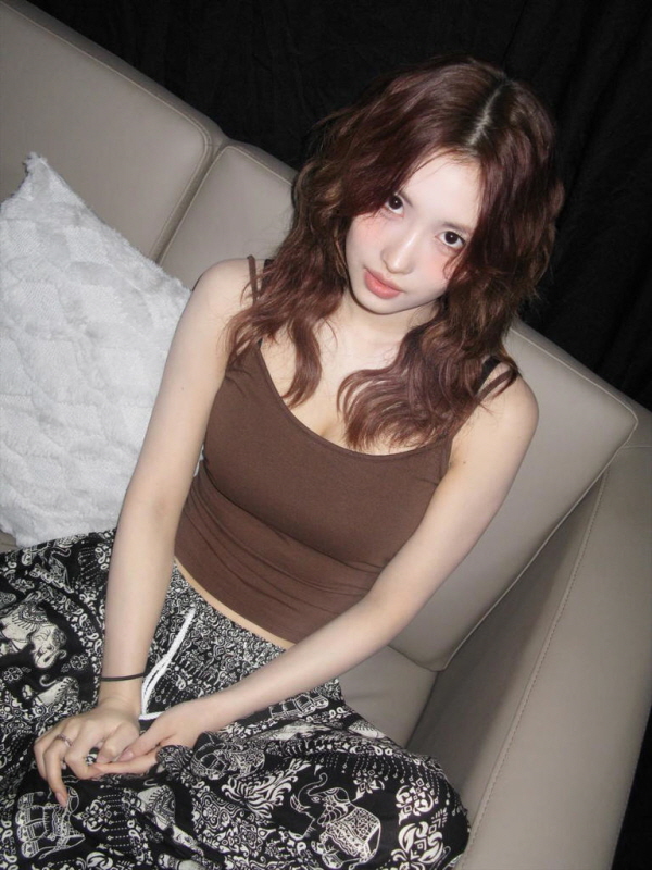 写真の中のTWICEモモは、柔らかいウェーブが生きているブラウントーンの長い髪を自然におろしてソファに座っている。単色のノースリーブのトップスとパターンがはっきりしたブラックパンツをマッチさせ、リラックスしていながらも個性が垣間見えるルックを完成させた。ソファの横に置かれた明るい色のクッションと暗い背景がコントラストを成し、モモの肌のトーンと表情をさらにはっきりと浮き彫りにした。