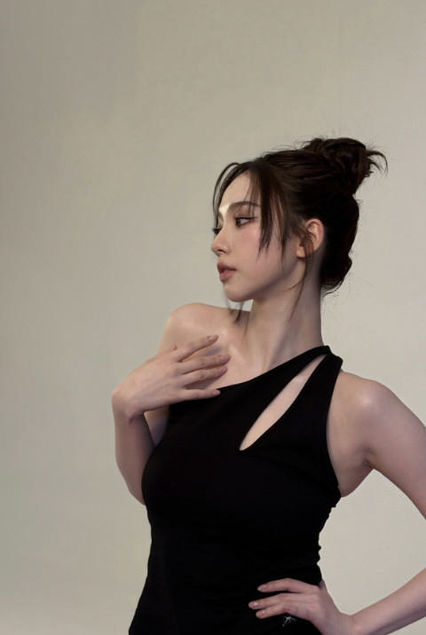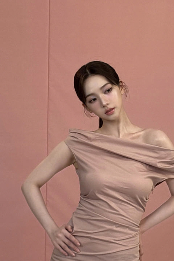 写真の中のカリナは、ビューティーグラビア撮影に集中している様子。カリナは、ブルーニットワンピースやホワイトホルターネックワンピースなどの多彩な衣装を完璧に着こなした。特に、ビューティー商品を活用し、顔と肩のラインを強調した演出は、カリナ特有のAIのようなビジュアルをより一層引き立たせた。