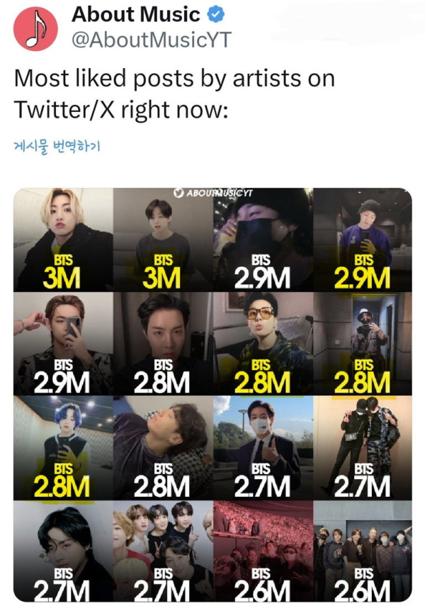 防弾少年団(BTS)ジョングクは、全世界音楽専門のニュースを伝える「アバウトミュージック」が注目した「X(旧ツイッター)」の最多「いいね」アーティスト投稿順位で、1位と2位を同時に占めた。ジョングクの「金髪自撮り」の投稿と「Never Not♡」の投稿は、それぞれ「いいね」300万以上を記録し、該当集計で頂上に上がった。