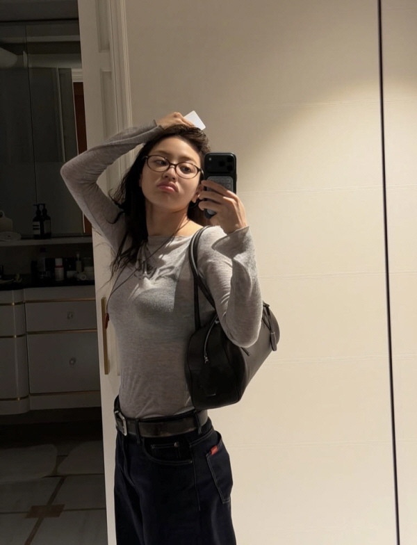 写真の中のジヒョは、メガネをかけて鏡の前で自撮りを撮っている。ラフなTシャツとジーンズに、レザーバッグまで加えられた落ち着いたスタイリングは、舞台の上の華やかな姿とは相反する魅力を伝えている。