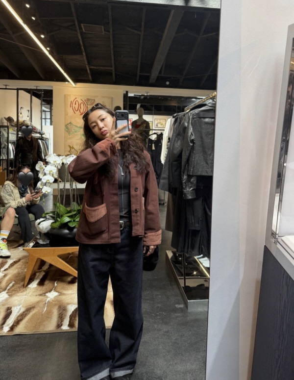 他の写真では、衣料品店に見える空間で、カジュアルなジャケットとオーバーフィットジーンズを着て、自然なポーズをとっている。過度な演出なしでも目を引く表情と雰囲気が際立っている。
