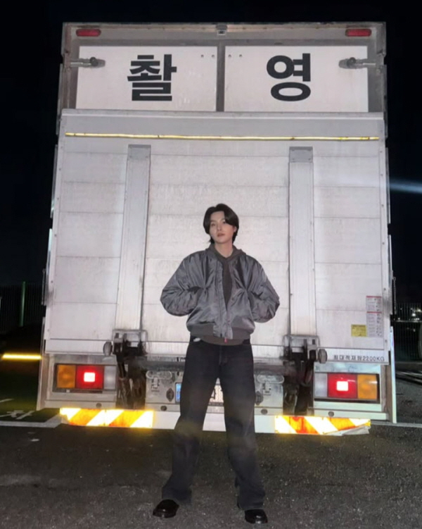 彼は実際に「撮影」と大きく書かれたトラックを背に、ポケットに手を入れてポーズを取っている。
