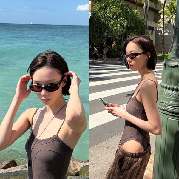 公開された写真の中、彼女はブラウントーンのスリーブレストップスにサングラスを合わせて、ミニマルながらも洗練された雰囲気を完成させた。短いヘアスタイルは独特な都会的なイメージを倍加し、さらに、欠点無く整った目鼻立ちはクローズアップでも光を放った。