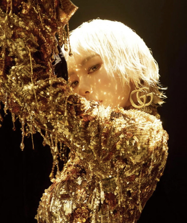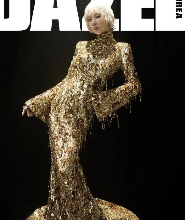 グラビアの中のニンニンは、大胆な金髪姿への変身で、神秘的ながらも強烈な雰囲気を発散した。ここに、ニンニンは全身を包む黄金色の刺繍のドレスをマッチし、魅惑的な姿を披露した。