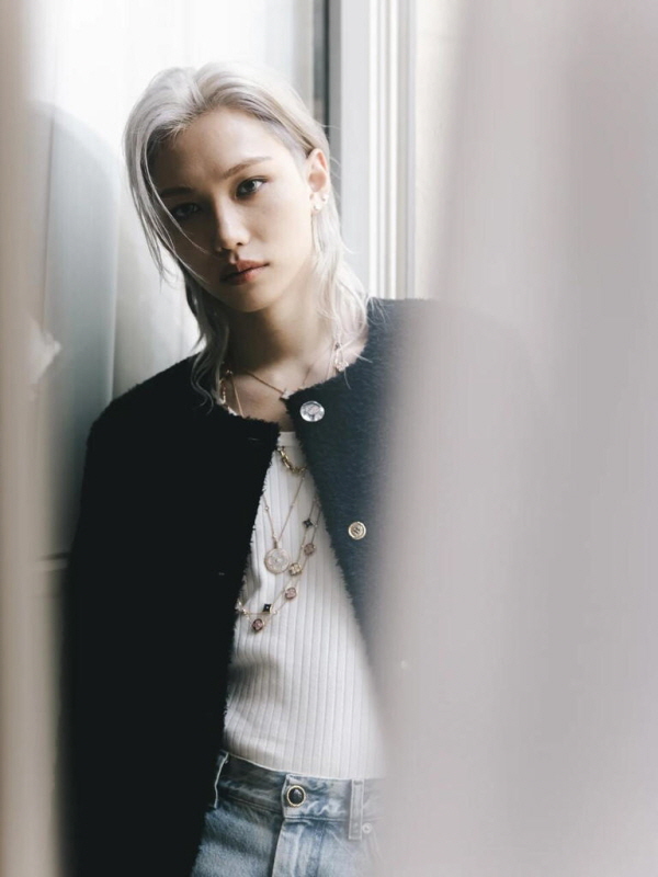 この写真には、フィリックスが室内空間で窓際にもたれかかっている姿が盛り込まれた。トップスには濃い色のジャケットを着て、白のインナーをマッチさせ、首には複数の重ね付けしたネックレスでスタイルを完成させた。