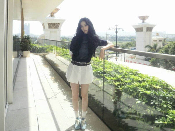 濃い色のトップスに薄い素材の黒いトップスをレイヤードしたカリナのスタイルに、白いミニスカートと薄いベルトを合わせて鮮やかなコントラストを作り、足首まで上がる白い靴下と水色のスニーカーを履いて、明るい色感のポイントを加えている。