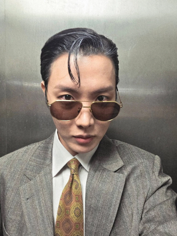 公開された写真の中のJ-HOPEは、前髪をあげて額を見せたポマードヘアスタイルに、大きなボーイングサングラスをマッチさせて、普段の爽やかないたずらっ子のようなイメージとは相反する、濃厚で荒々しいカリスマを発散した。グレー系のクラシックなスーツとヴィンテージパターンのネクタイは、J-HOPEだけの卓越したファッション消化力をもう一度証明した。