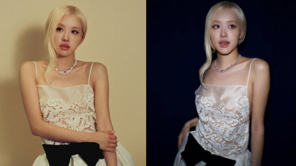 公開された写真の中で、ロゼはアイボリートーンのスリップドレスにブラックリボンのポイントを加えたスタイリングで、高級感のある雰囲気を完成させた。