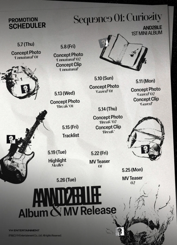 AND2BLEは4月28日、ミニ1集「Sequence 01: Curiosity」のプロモーションスケジューラを公開した。プロモーションスケジューライメージ内には、ギター、ヘッドセットなどのオブジェが随所に配置されている。